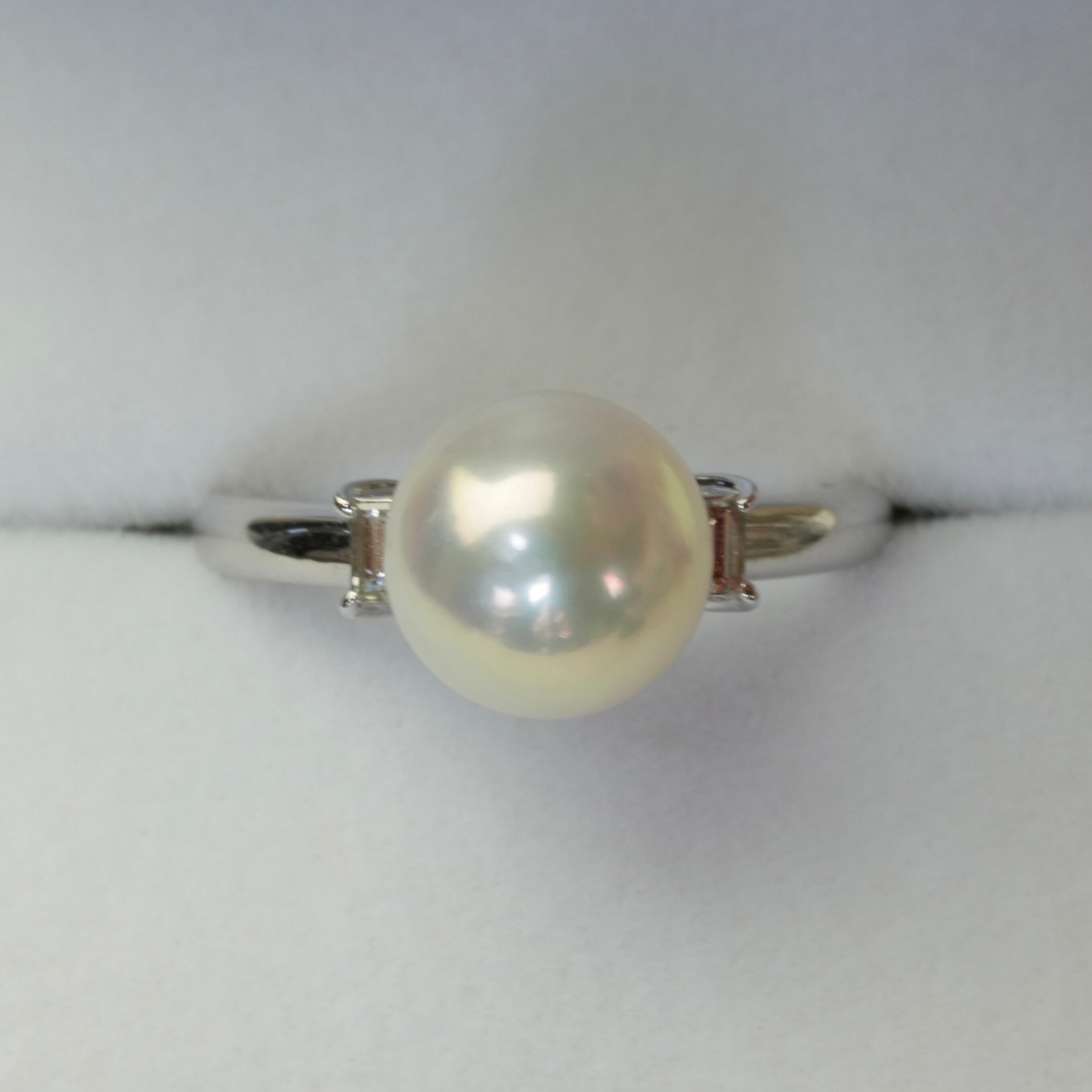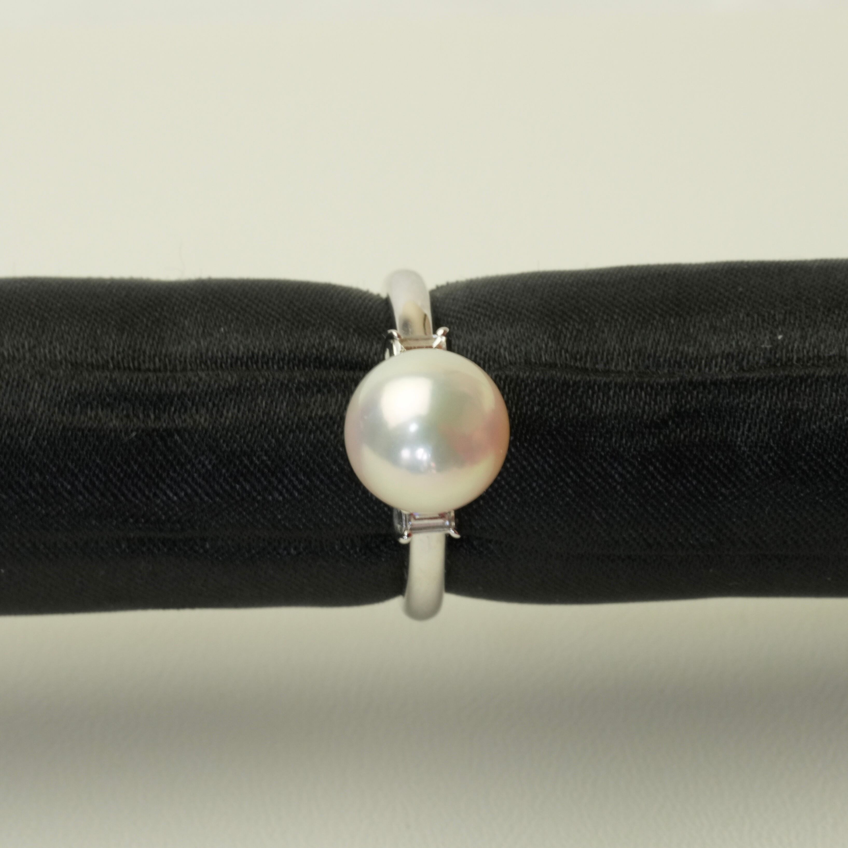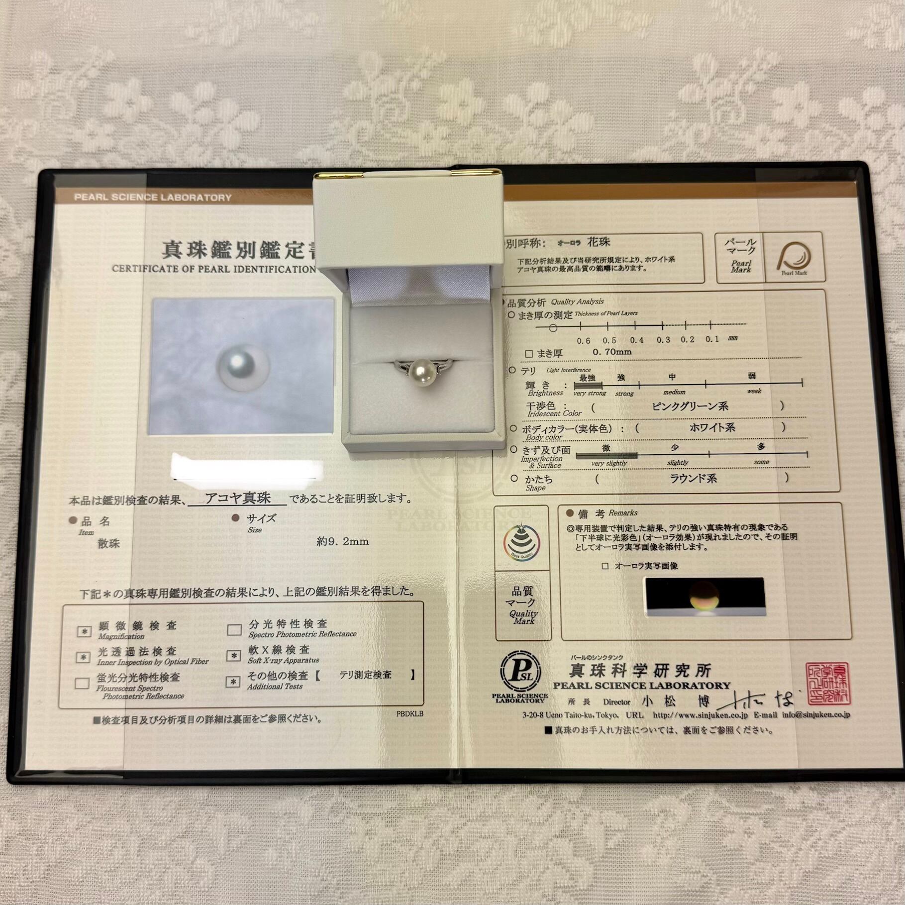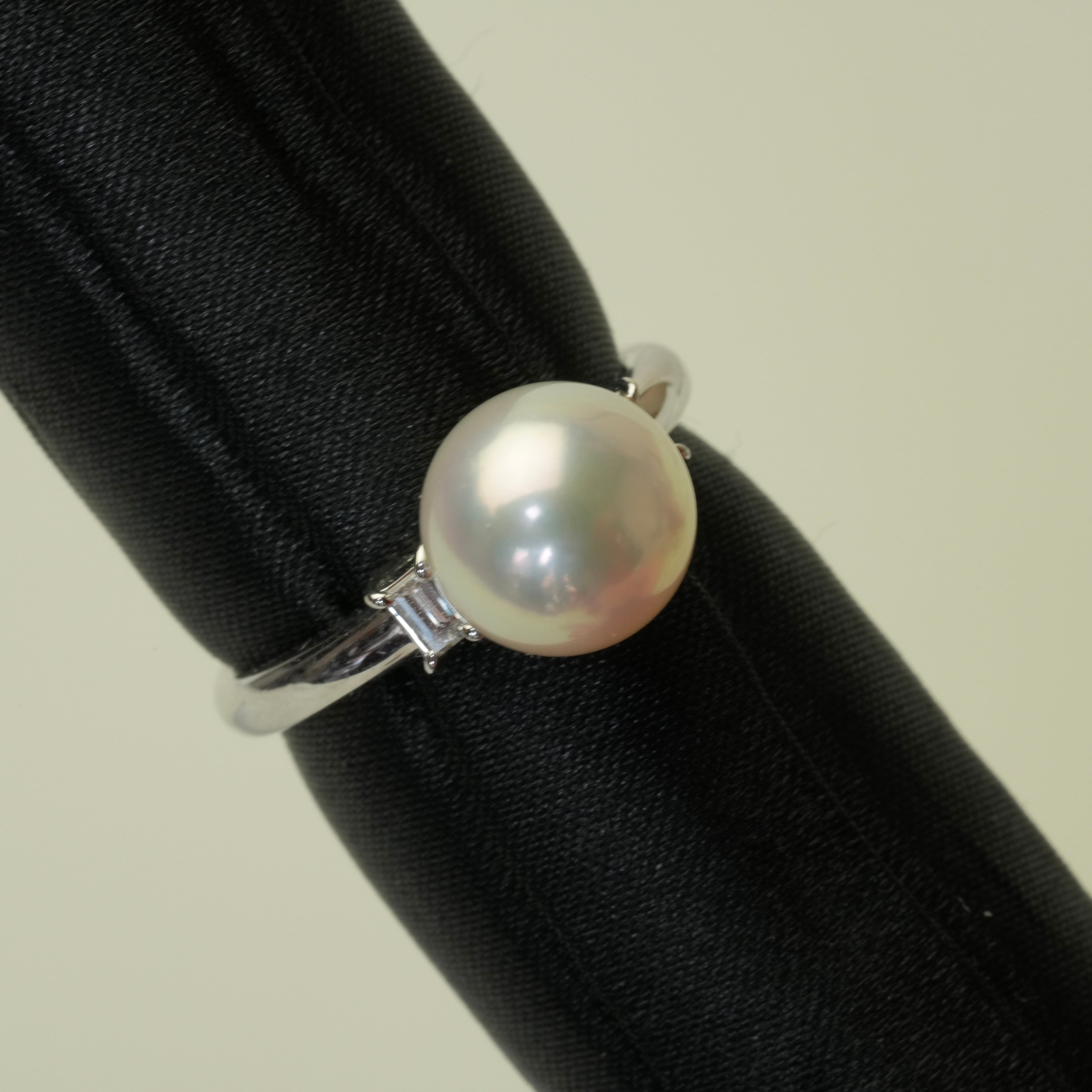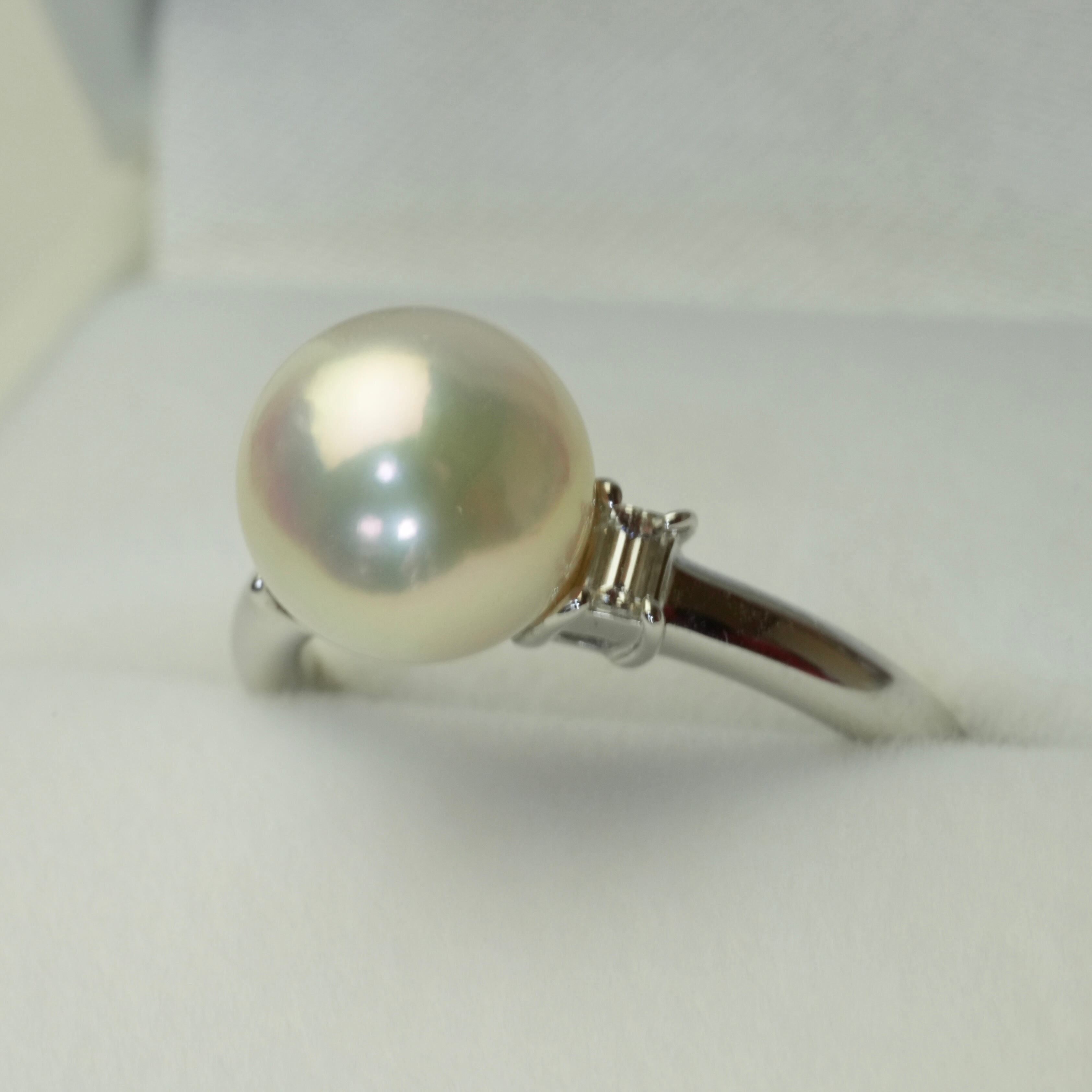 形はとても綺麗なラウンドです。こちらの真珠には真珠科学研究所さんが発行された【オーロラ花珠鑑別書】が付属しますが、まき厚0.70mmという評価をされており、奥深い真珠層の巻きが手元で楽しめる作品です。