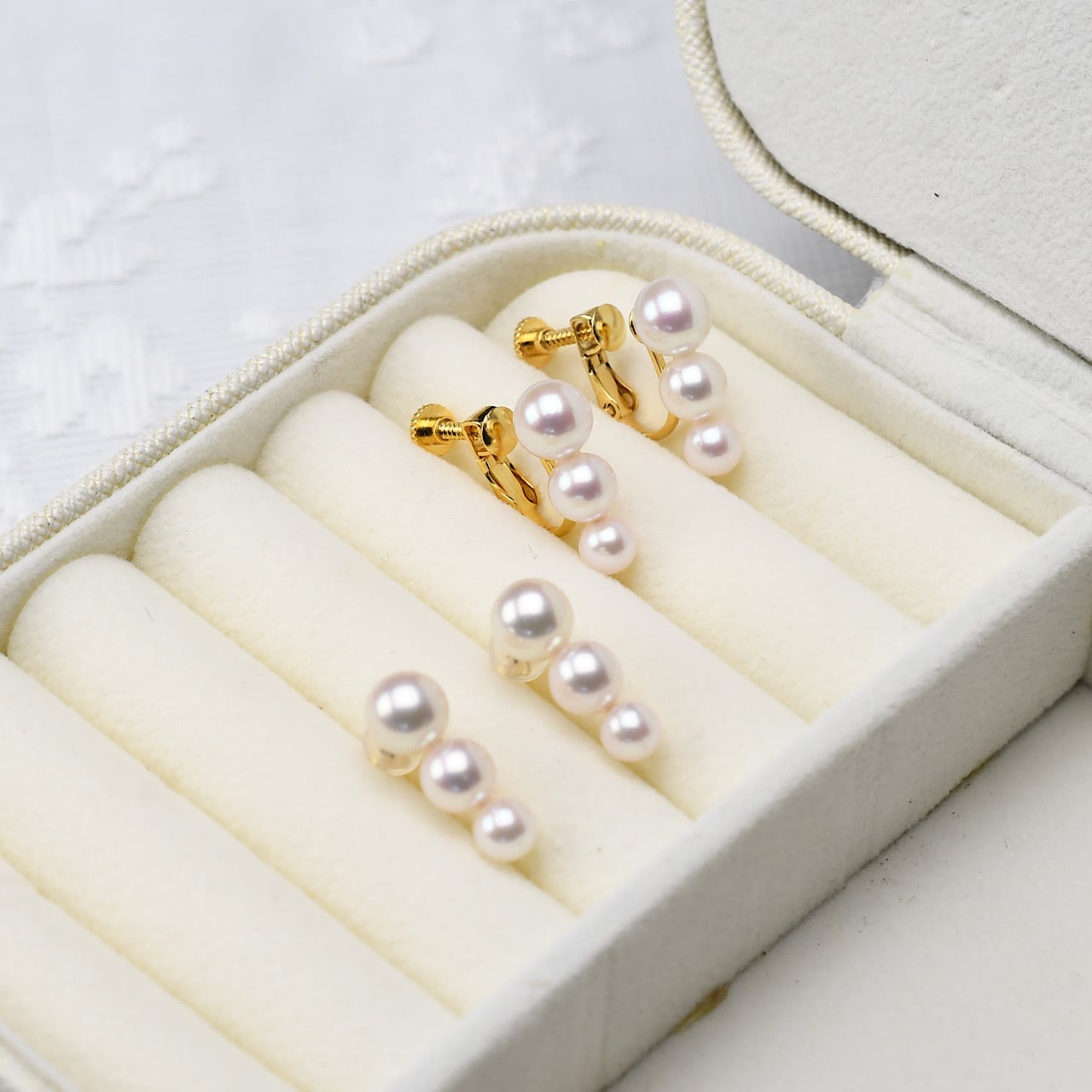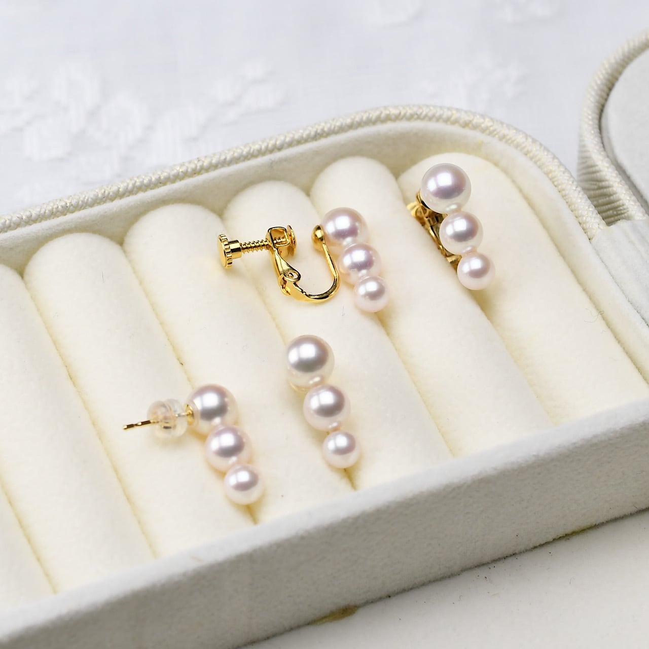日本産あこや真珠で製作した3連のグラデーションパールピアスです。