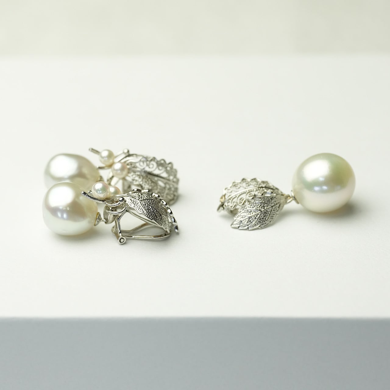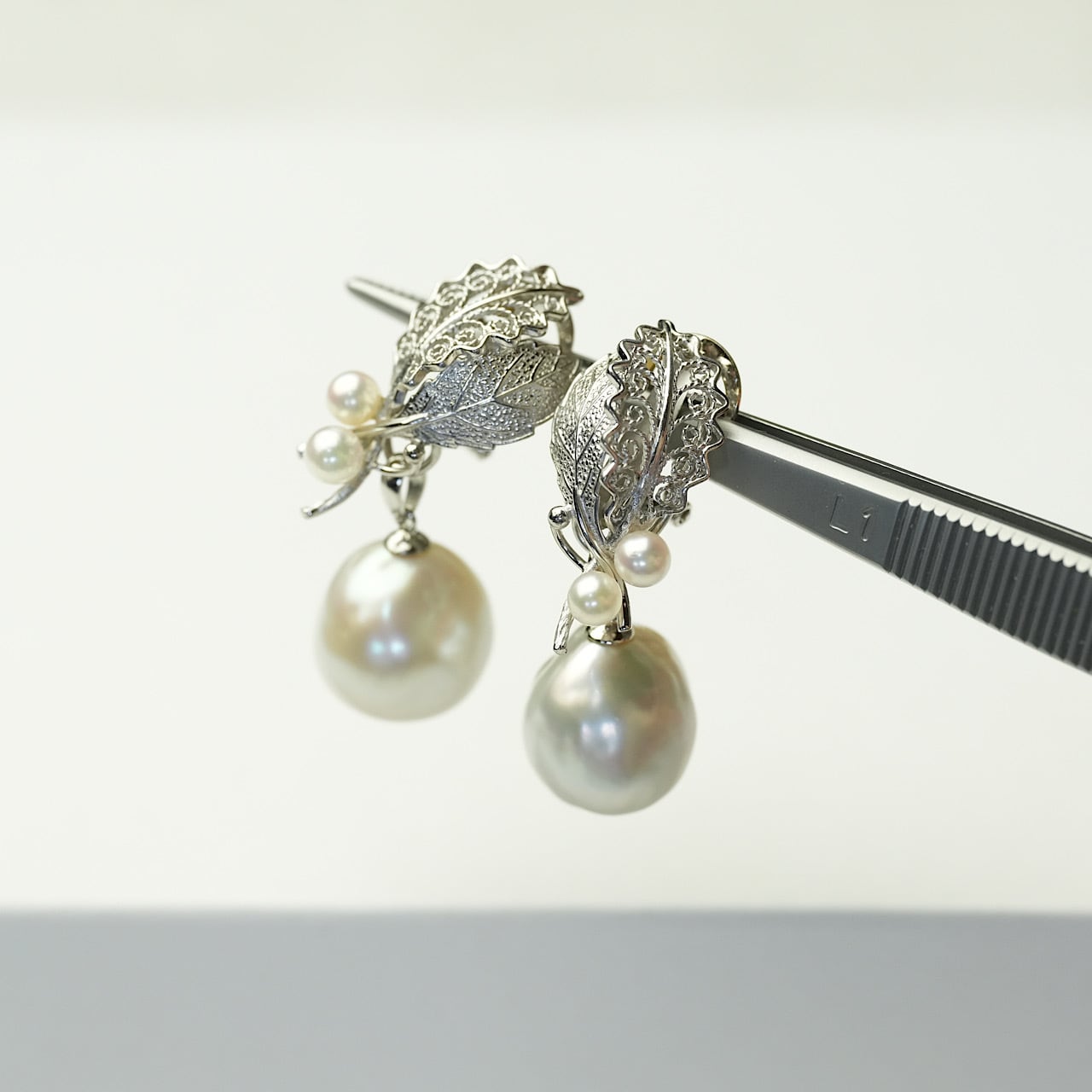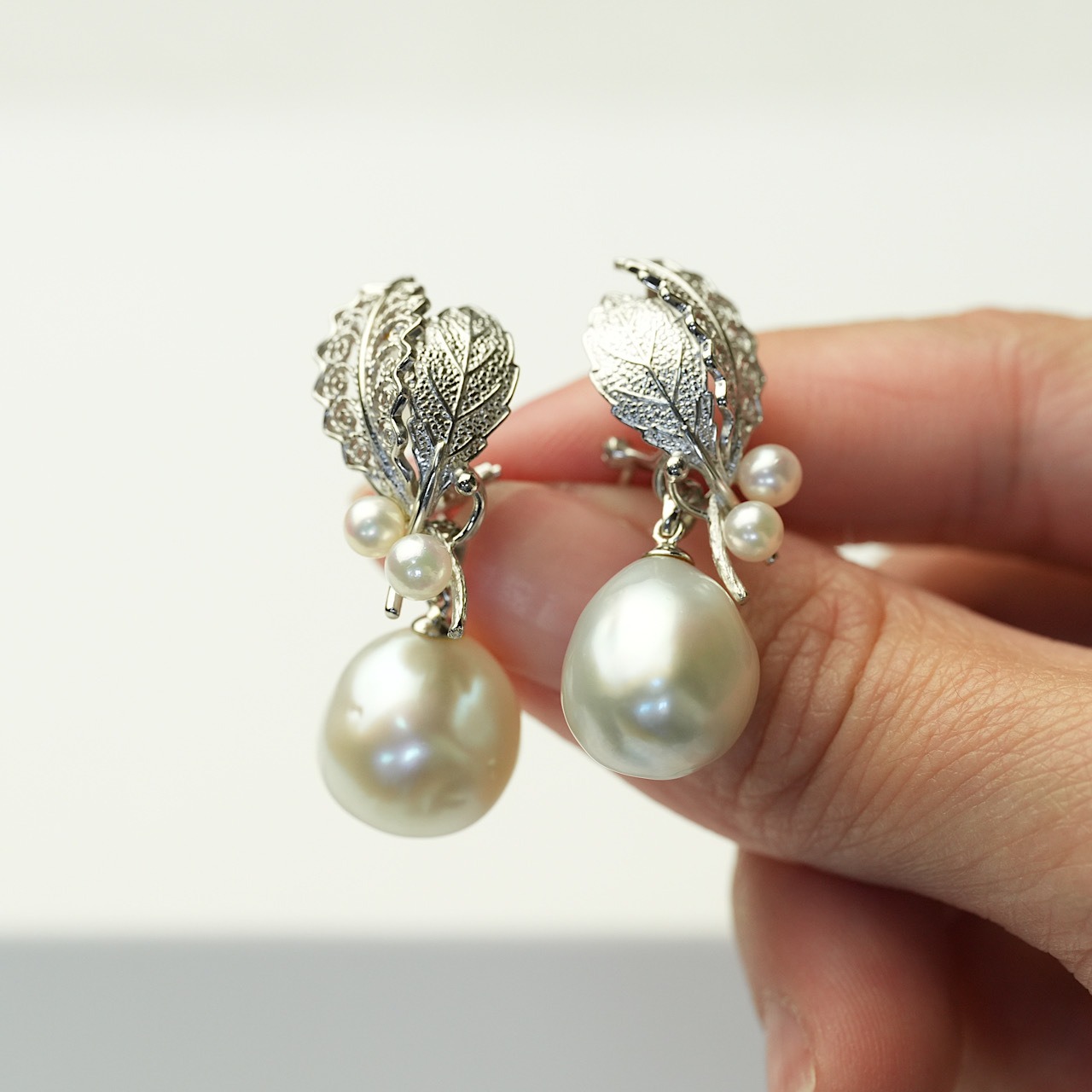 南洋真珠の13.5-14.0mmで製作されたペンダントトップで、リーフモチーフが印象的な作品です。真珠のサイズはあこや真珠にはないサイズ感でとても大きく、ご満足いただけるサイズ感となっています。真珠の形はラウンドというよりかは少しオーバルの形に近いような真珠を用いて製作されています。