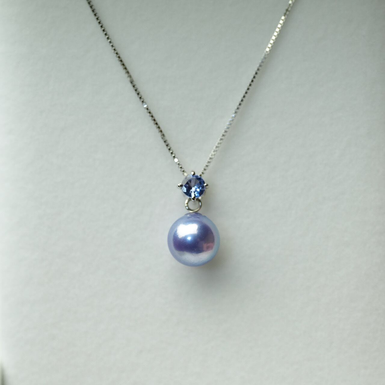 こちらの作品はゾイサイトという名前の宝石と、当店のカラーパールを組み合わせた企画作品です。ラベンダーカラーのあこや真珠は生産できる会社が日本の中でも限られており、当店のラベンダーパールは素晴らしい発色が魅力です。
