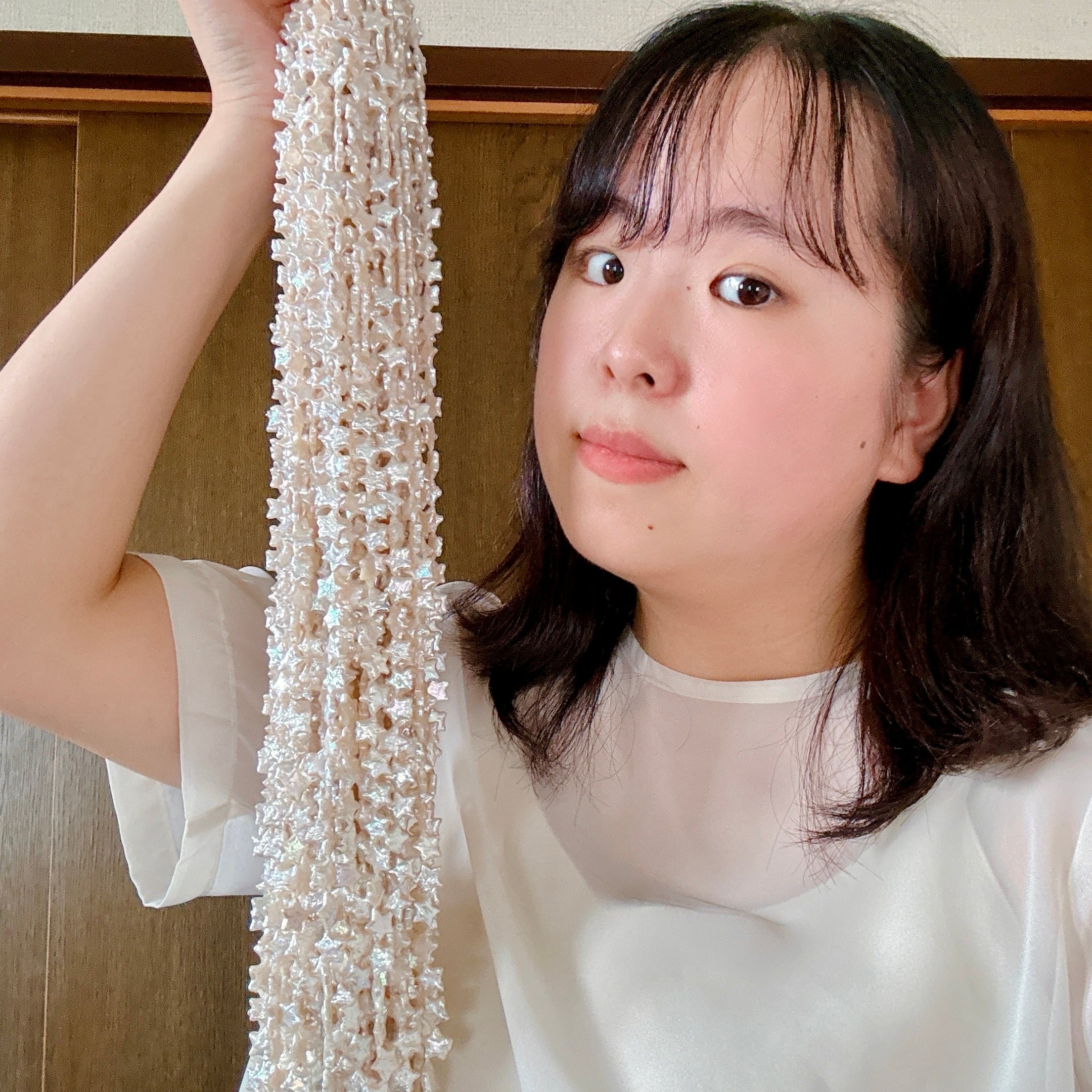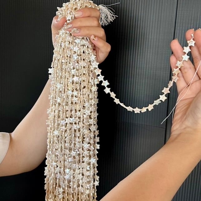 こちらの作品は淡水真珠の星形のみを一本の連材にした商品です。真珠の形状は両穴で、一つ一つが星の形に近い姿をしています。